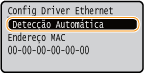 Ethernet é uma norma utilizada na transmissão de dados numa rede de área local (LAN). Pode definir o modo de comunicação e o tipo de Ethernet. De um modo geral, é possível utilizar a máquina sem alterar as predefinições (<Configurações do Driver Ethernet>), mas pode alterar estas definições para se adequarem ao seu ambiente de rede.