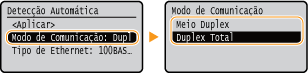 Envia e recebe dados de comunicação alternadamente. Selecione esta opção quando a máquina estiver ligada a um dispositivo de rede que utilize semiduplex. <Duplex Total>