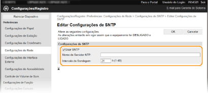 O SNTP da máquina é compatível com servidores NTP (versão 3) e SNTP (versões 3 e 4).