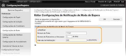 Selecione a caixa de verificação para notificar o software de gestão de dispositivos sobre o estado de energia da máquina. Se selecionar [Notificar], a máquina evita comunicações desnecessárias durante o modo Sleep e reduz o consumo total de energia. [Número de Porta]