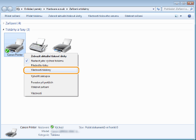 Klikněte pravým tlačítkem na ikonu ovladače tiskárny pro dané zařízení a klikněte na možnost [Vlastnosti tiskárny] nebo [Vlastnosti].