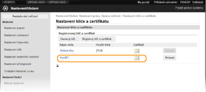 Klíč a certifikát nelze smazat, jestliže se z nějakého důvodu aktuálně používají, např. když je v části [Použití klíče] uvedeno „[TLS]“ nebo „[IEEE 802.1X]“. V takovém případě je před smazáním nutné příslušnou funkci zakázat nebo klíč a certifikát vyměnit.