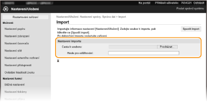 Data nastavení zařízení lze uložit do počítače (export). Data, která jsou uložena v počítači, je možné registrovat v zařízení (importovat). Data exportovaná z tohoto zařízení lze importovat do jiného zařízení stejného modelu. Různá data nastavení lze tedy snadno zkopírovat do více strojů. Pokud chcete použít tuto funkci, musíte se přihlásit v režimu správce systému.
