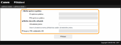 Prostřednictvím Vzdáleného uživatelského rozhraní můžete provádět všechny operace a nastavení. Zadejte příslušné ID do pole [ID správce systému] a PIN do pole [PIN správce systému].