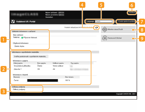 Když se přihlásíte do Vzdáleného uživatelského rozhraní, objeví se následující stránka portálu. V této části jsou popsány položky zobrazené na stránce portálu a základní operace.