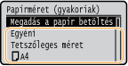 Az alapértelmezett papírbeállítás bejegyzése után a papírok behelyezésekor nem jelenik meg a papírbeállító képernyő, a készülék mindig ugyanazt a beállítást alkalmazza. Ha a papírbeállítások módosítása nélkül helyez be más méretű vagy típusú papírt, akkor a készülék valószínűleg nem megfelelően fog nyomtatni. A probléma kikerüléséhez válassza a <Megadás a papír betöltésekor> lehetőséget a 3. lépésben, majd töltse be a papírt.