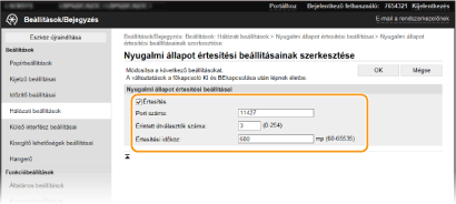 A jelölőnégyzet bejelölésével értesíthet egy eszközfelügyeleti szoftvert a készülék üzemállapotáról. Ha az [Értesítés] jelölőnégyzet be van jelölve, akkor a készülék alvó üzemmódban várhatóan elkerüli a felesleges kommunikációt, és csökkenti a teljes energiafogyasztást. [Port száma]