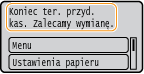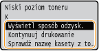 Jeżeli komunikat zostanie wyświetlony podczas odbierania I-faksu, urządzenie nie wykona drukowania w celu zapobieżenia uzyskaniu niewyraźnego wydruku. Aby kontynuować drukowanie pomimo niskiego poziomu toneru w zasobniku, dla opcji <Kontynuuj druk., gdy mało atram. w kas.> wybierz ustawienie <Włącz>. <Kontynuuj druk., gdy mało atram. w kas.>