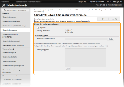 Nieprawidłowo wprowadzone adresy IP mogą uniemożliwić dostęp do urządzenia z poziomu Zdalnego interfejsu użytkownika. Konieczne będzie wtedy ustawienie filtra <Filtr adresów IPv4> albo <Filtr adresów IPv6> na <Wyłącz>.