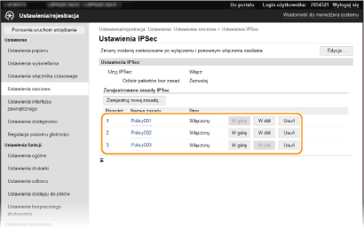 Korzystanie z panelu sterowaniaKomunikację szyfrowaną z użyciem protokołu IPSec można również włączyć albo wyłączyć z poziomu <Menu> na ekranie Główny. <Użyj IPSec>