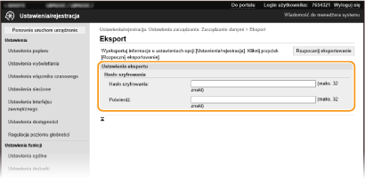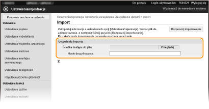Dane ustawień urządzenia można zapisać w komputerze (eksportować). Dane zapisane na komputerze można zarejestrować w urządzeniu (importować). Dane wyeksportowane z tego urządzenia można zaimportować do innego urządzenia o takim samym modelu. Dzięki temu możliwe jest łatwe skopiowanie rozmaitych danych ustawień do wielu urządzeń. Aby korzystać z tych funkcji, wymagane jest zalogowanie się do trybu menedżera systemu.