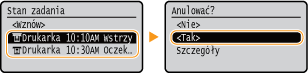 Anulowanie w Zdalnym interfejsie użytkownikaWydruk można anulować na stronie [Stan zadania] w Zdalnym interfejsie użytkownika: Sprawdzanie bieżącego stanu drukowanych dokumentów