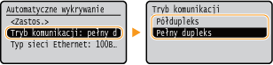 Naprzemienne wysyłanie i odbieranie danych komunikacyjnych. Opcję tę należy wybrać, gdy urządzenie jest podłączone do urządzenia sieciowego w trybie półdupleks. <Pełny dupleks>