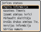 Parāda tonera kasetnēs atlikušo tonera daudzumu. Pirms tonera beigšanās var beigties citu iekšējo daļu darbmūžs.