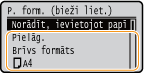 Ja jums ir bieži jāmaina ievietojamais papīrs, izmantojiet opciju <Brīvs formāts> — tādējādi katrā iekārtas lietošanas reizē varēsit mainīt iestatījumu, veicot mazāku skaitu darbību. Ja iestatījums printera draiverī ievērojami atšķiras no ievietotā papīra formāta, iekārtā var arī tikt parādīts kļūdas ziņojums.