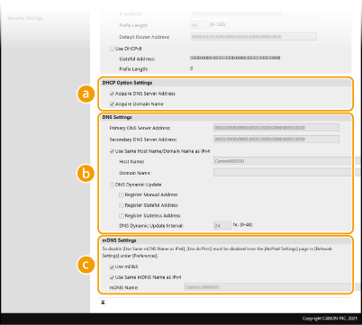 Atzīmējiet šo izvēles rūtiņu, lai izmantotu to pašu mDNS nosaukumu, kas tiek lietots IPv4. Lai iestatītu citu nosaukumu, noņemiet atzīmi no izvēles rūtiņas un ievadiet mDNS nosaukumu tekstlodziņā [mDNS Name]. |