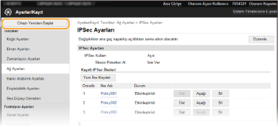 Değiştirilen ayar öğelerine bağlı olarak, makineyi yeniden başlatarak değişiklikleri etkinleştirmeniz gerekebilir. Bu bölümde, makinenin nasıl yeniden başlatılacağı açıklanmaktadır.
