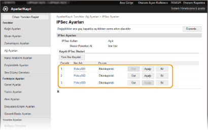 İşletim panelini kullanmaIPSec iletişimini, Ana Ekran'daki <Menü> öğesinden de etkinleştirebilir veya devre dışı bırakabilirsiniz. <IPSec Kullan>