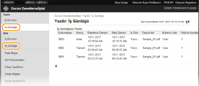 Ayrıntılı bilgileri görüntülemek için duraklatılan belgelerde ve güvenli belgelerde [İş Numarası] öğesine tıklayın. Yazdırılan belgenin kullanıcı adını ve sayfa sayısını kontrol edebilirsiniz.