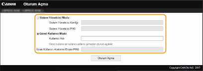 Tüm Uzak Kullanıcı Arabirimi işlemlerini ve ayarlarını gerçekleştirebilirsiniz. Uygun Kimliği (ID) [Sistem Yöneticisi Kimliği] öğesine ve PIN'i [Sistem Yöneticisi PIN'i] öğesine girin.