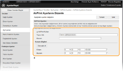 AirPrint ayarlarında girilen makinenin adı ve konumu gibi değerleri kontrol etmenizi sağlar. Ayarları değiştirmek için [Düzenle] öğesine tıklayabilirsiniz.