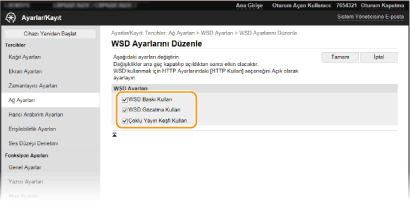 WSD aracılığıyla bir bilgisayardan makine hakkında bilgi almak için onay kutusunu seçin. [WSD Baskı Kullan] onay kutusu seçildiğinde bu onay kutusu otomatik olarak seçilir. [Çoklu Yayın Keşfi Kullan]
