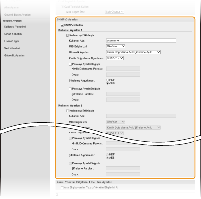 Basit Ağ Yönetimi Protokolü (SNMP), Yönetim Bilgi Tabanı (MIB) kullanılarak bir ağdaki iletişim aygıtlarını izleme ve kontrol etme protokolüdür. Makine, SNMPv1'i ve güvenliği geliştirilmiş SNMPv3'ü destekler. Belgeleri yazdırırken veya Uzak Kullanıcı Arabirimini kullanırken bir bilgisayardan makinenin durumunu kontrol edebilirsiniz. SNMPv1 veya SNMPv3'ü ayrı ayrı veya her ikisini de aynı anda etkinleştirebilirsiniz. Her bir sürümün ayarlarını, ağ ortamınıza ve kullanım amacınıza uyacak şekilde belirtin.