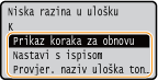 Ako se tijekom primanja dokumenta I-faksom prikaže poruka, uređaj neće ispisivati da bi se izbjegao nejasan ispis. Da biste nastavili ispisivati čak i ako je razina tonera u spremniku niska, opciju <Nastavite s ispisom. Kad je k. u ul. n.> postavite na <Uključ.>. <Nastavite s ispisom. Kad je k. u ul. n.>