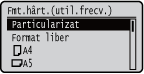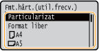 Dacă ecranul afişat mai sus nu este afişat când încărcaţi hârtieDacă încărcaţi mereu aceeaşi hârtie în tava universală, puteţi sări peste setarea pentru hârtie dacă înregistraţi dimensiunea şi tipul hârtiei ca setare implicită. Când setarea implicită este înregistrată, totuşi, ecranul de mai sus nu este afişat. Pentru a afişa ecranul, selectaţi <Specificare la încărcarea hârtiei> (Înregistrarea setărilor implicite de hârtie pentru tava multifuncţională).