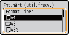 Dacă trebuie să schimbaţi frecvent hârtia care trebuie încărcată, setaţi la <Format liber>; această opţiune va reduce numărul de paşi necesari pentru schimbarea de fiecare dată a setării. De asemenea, puteţi afişa un mesaj de eroare când setarea din driverul de imprimantă este foarte diferită de formatul de hârtie încărcată.