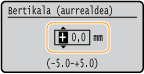 Inprimatzeko kokapena doitzeko, zehaztu noranzkoa "+" eta "-" erabiliz eta distantzia "mm." erabiliz. <Doitu bertikalki (aurrealdea)>/<Doitu bertikalki (atzealdea)> bereizlerako, zehaztu "+" sinboloa duen balio bat inprimatzeko kokapena goitik behera aldatzeko. <Doitu horizontalki (aurr.)>/<Doitu horizontalki (atz.)> aukeran, zehaztu "+" sinboloa duen balio bat inprimatzeko kokapena ezkerretik eskuinetara aldatzeko. Kontrako norantzan aldatzeko, zehaztu "-" sinboloa duen balio bat.