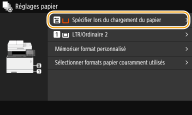 Une fois les paramètres papier par défaut enregistrés, l'écran de définition du papier ne s'affiche plus lorsque vous insérez du papier, et les mêmes paramètres sont appliqués systématiquement. Si vous chargez un papier de format ou de type différents sans modifier les paramètres papier, l'appareil risque de ne pas imprimer correctement. Pour éviter ce problème, sélectionnez <Spécifier lors du chargement du papier> à l'étape 3, puis chargez le papier. |