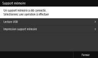 Si l'option <Aff. cont. sup. mém. conn.> est réglée sur <Activé>, les opérations disponibles s'affichent lorsque vous insérez un périphérique mémoire USB alors que l'écran Accueil est affiché. <Aff. cont. sup. mém. conn.> ![]() Comme les écrans ne sont pas toujours affichés en mode Veille, quittez le mode Veille avant d'insérer un périphérique mémoire USB. |
