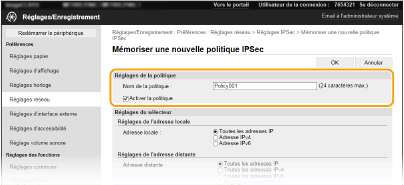 Sélectionnez [Réglages réseau]  [Réglages IPSec].