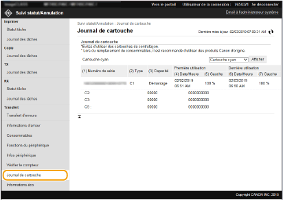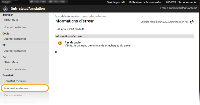 Pour pouvoir travailler avec les documents dont le transfert a échoué, vous devez faire les réglages suivants : Définissez <Ut. verr. mémoire> sur <Activé>. Définissez <Utiliser aperçu fax> sur <Activé>. Connectez-vous à l'interface utilisateur en mode Administrateur système. Vous pouvez cliquer sur [Supprimer] pour supprimer les documents dont le transfert a échoué. Vous pouvez cliquer sur [Numéro de tâche] pour afficher les informations détaillées ou un aperçu du document dont le transfert a échoué. Vous pouvez aussi imprimer, renvoyer ou supprimer les documents dont le transfert a échoué depuis le panneau de commande de l'appareil. |