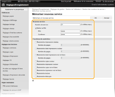 2 | Spécifiez les paramètres obligatoires. [Numéro de service] Saisissez l'ID de service à enregistrer. [Définir le PIN] Pour définir un code PIN, cocher la case et saisissez le même nombre dans les zones de texte [PIN] et [Confirmer]. [Fonctions de restriction] Vous pouvez limiter le nombre de pages à imprimer et les fonctions accessibles aux services. Pour limiter le nombre de pages à imprimer, cochez la case associée au type souhaité et saisissez le nombre de pages approprié dans [Nombre de pages]. Cochez les cases des fonctions dont vous souhaitez restreindre l'accès. Si la case [Restreindre lecture] est cochée, les fonctions Enregistrer sur périphérique mémoire USB, Envoyer un e-mail et Envoyer dans un dossier partagé ou un serveur FTP sont toutes restreintes. Vous pouvez également restreindre d'autres méthodes qui numérisent des documents en les important sur un ordinateur, mais, dans ce cas, vous ne pouvez pas bloquer l'accès pour chaque ID de service ( Blocage de tâches en cas de numéro de service inconnu). |