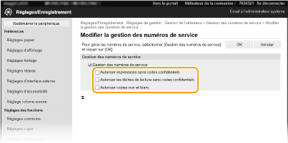 Pour en savoir davantage sur les cases à cocher [Autoriser impressions sans codes confidentiels]/[Autoriser les tâches de lecture sans codes confidentiels]/[Autoriser copies noir et blanc], reportez-vous à la section
