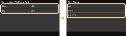 Sélectionnez un langage de description de page de sorte que l'appareil soit détecté en tant qu'imprimante compatible avec ce langage lorsqu'il est relié à un ordinateur par Plug-n-Play.