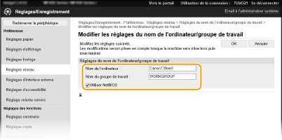 Le nom du groupe de travail est un nom rassemblant plusieurs ordinateurs de sorte que les fonctions de réseau de base, telles que le partage de fichiers, soient disponibles dans un réseau Windows. Saisissez le nom du groupe de travail auquel l'appareil appartient en caractères alphanumériques.