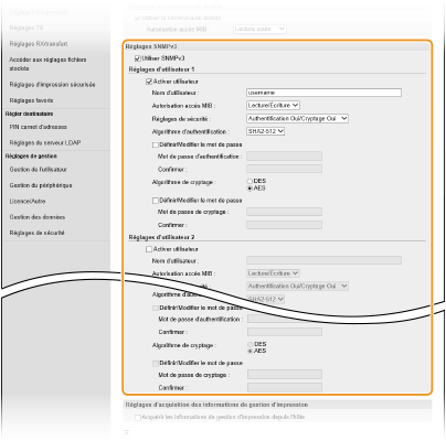 Le protocole SNMP (Simple Network Management Protocol) est un protocole dédié à la surveillance et au contrôle des périphériques de communication d'un réseau et fait intervenir une base d'informations de gestion MIB (Management Information Base). L'appareil prend en charge la version SNMPv1 ainsi que la version SNMPv3 dotée de fonctions avancées de sécurité. Vous pouvez vérifier le statut de l'appareil à partir d'un ordinateur lorsque vous imprimez des documents ou utilisez l'interface utilisateur distante. Vous êtes libre d'activer SNMPv1, SNMPv3 ou encore les deux protocoles à la fois. Indiquez les réglages de chaque version de façon à les adapter à votre environnement réseau et à l'utilisation du réseau.