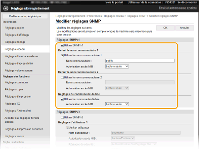 Si les deux versions du protocole SNMP sont activées en même temps, il est recommandé de définir les droits d'accès MIB pour SNMPv1 sur [Lecture seule]. Il est possible de définir différemment les droit d'accès MIB pour les protocoles SNMPv1 et SNMPv3 (ainsi que pour chaque utilisateur dans SNMPv3). Sélectionner [Lecture/Écriture] (tous les droits d'accès) dans SNMPv1 annule les puissantes fonctions de sécurité qui caractérisent SNMPv3, car la plupart des réglages de l'appareil sont alors contrôlés par SNMPv1. |