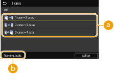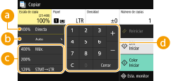 <Tipo orig./acab.>![]() | Puede ampliar o reducir las copias utilizando una escala de copia preestablecida, como por ejemplo <STMT->LTR> o estableciendo una escala de copia personalizada en incrementos del 1 %. |