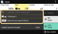 <Selección auto papel (LTR/LGL)> podría no aparecer en función del modelo que se esté utilizando. <Selección auto papel (LTR/LGL)> no está disponible cuando no hay ningún original cargado en el alimentador. <Selección auto papel (LTR/LGL)> no se encontrará disponible cuando se utilice <N en 1>, <Borrar marco> o <Copia de carné>. |