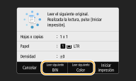 1 | Coloque el original siguiente sobre el cristal de la platina y seleccione <Leer siguiente>. También podrá especificar <Densidad>, <Tipo de original> y <Balance de color> para cada original por separado. ![]() Repita este paso hasta que termine de escanear todo el original. |