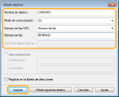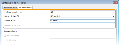 Si el campo [Confirmar número de fax] o [Confirmar URI] está activo, introduzca también el número correspondiente en ese campo. La opción para confirmar o no los números introducidos puede modificarse en la pantalla del controlador de fax. Para obtener más información, haga clic en [Ayuda] en la pantalla del controlador de fax.