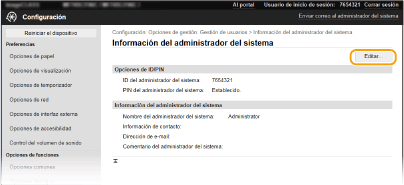 Algunas de las opciones solo pueden cambiarse si ha iniciado sesión en el Modo de administrador del sistema.