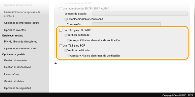 Marque la casilla de verificación para utilizar TLS para cifrar la comunicación con el servidor de SMTP. Marque la casilla de verificación [Verificar certificado] o [Agregar CN a los elementos de verificación] en función de sus necesidades.
