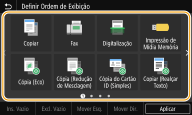 É possível adicionar botões de atalho à tela Início para funções usadas com frequência como <Copiar>, <Fax> e <Digitalização>. Por exemplo, você pode realizar tarefas rapidamente e com eficiência atribuindo a um único botão uma sequência de configurações (por exemplo: "digitalizar os dois lados de um original, salvá-lo como arquivo PDF altamente comprimido e enviá-lo por e-mail").