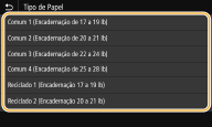 Depois que a configuração de papel padrão é registrada, a tela de configuração de papel não é exibida quando o papel é carregado, e a mesma configuração é usada. Se você carregar um tamanho ou tipo de papel diferente, a máquina pode não imprimir corretamente. Para evitar este problema, selecione <Especificar ao Colocar Papel> na etapa 3 e depois carregue o papel. |