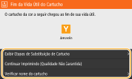 Quando uma mensagem é exibida Ao copiar ou imprimir, você pode continuar a impressão o original. Se uma mensagem for exibida para o cartucho de toner preto quando a máquina está recebendo um fax/I-Fax, ou quando uma impressão de relatório automática está sendo feita, os faxes/I-Faxes recebidos e relatórios serão armazenados na memória, assim não sairão desbotados depois de impressos. Para continuar a imprimir mesmo se a quantidade restante no cartucho de toner estiver baixa, defina <Continue Imp Qdo Cart Baixo> como <Ativado>. <Continue Imp Qdo Cart Baixo>Especificar quando esta mensagem é exibida |